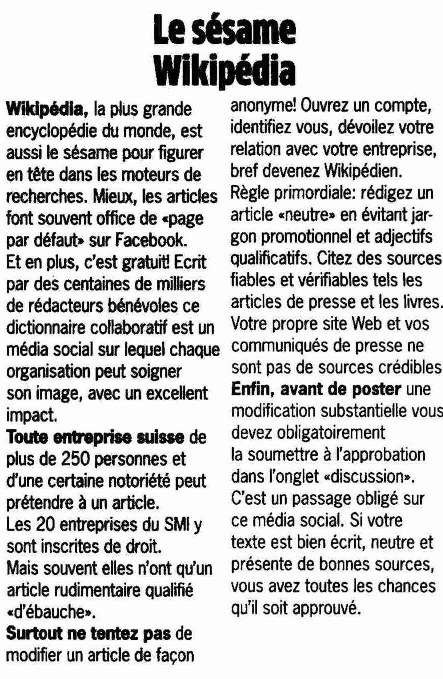 Toute entreprise suisse de plus de 250 personnes et d’une certaine notoriété peut prétendre à un article. Les 20 entreprises du SMI y sont inscrites de droit. Mais souvent elles n’ont qu’un article rudimentaire qualifié « d’ébauche », tout en bas de l’échelle de valeur des articles de Wikipédia. Julius Bär, « la plus grande banque suisse de gestion de titres » mériterait mieux qu’une seule ligne!