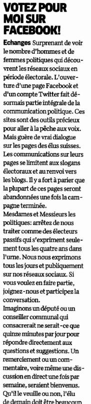 Mais guère de vrai dialogue sur les pages des élus suisses. Les communications sur leurs pages se limitent aux slogans électoraux et au renvoi vers leurs blogs. Il y a fort à parier que la plupart de ces pages seront abandonnées une fois la campagne terminée. Dans ces conditions ce n’est vraiment pas la peine de devenir fan d’un homme politique sur Facebook.