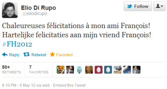 Les premiers chefs d’état et de gouvernement à féliciter personnellement François Hollande le soir de son élection étaient le premier ministre belge Elio di Rupo suivi du gouvernement croate, du premier ministre norvégien Jens Stoltenberg, du président haïtien Michel Martelly, de la Commission Européenne, du président du Conseil Européen Herman van Rompuy et du porte-parole d’Angela Merkel. David Cameron s’est contenté de twitter un lien vers leur communiqué.
