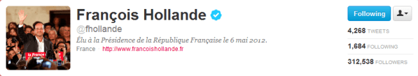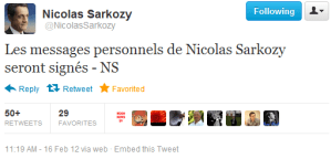 Autre particularité à retenir : François Hollande n’a jamais twitté personnellement alors que Nicolas Sarkozy a signé une poignée de tweets personnels avec ses initiales NS. Il reste à voir si le compte du candidat Hollande deviendra le compte personnel du président de la république ou si l’activité se met en sourdine jusqu’aux prochaines élections.