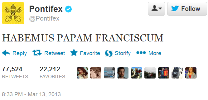 Enfin moins d’une heure après son accession le nouveau @Pontifex s’est fendu d’un premier tweet, retweeté plus de 77,000 fois depuis: « HABEMUS PAPAM FRANCISCUM » (Nous avons le Pape François). Il y a deux problèmes avec ce message ‘personnel’ papal : il est écrit à la première personne du pluriel et il est tout en lettres capitales, ce qui signifie que l’on elève sa voix. C’est probablement l’excitation du community manager pontifical qui a permis cet énorme bourde. Il aurait mieux fait de tweeter en direct les premiers mots du Pape François: « Frères et Sœur, priez pour moi. »